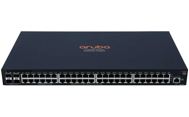 DiferencialSwitch de acesso Gig + 10 G popular, 52 portas Aruba. Este modelo tem 48 portas 10/100/1000 e 4 slots de transceptor 10G/1G SFP+ para conectividade de uplink.