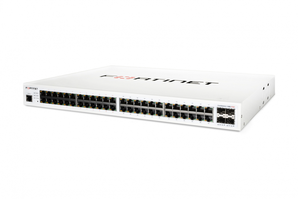 Switch Fortinet FS-148F-FPOE - FortiSwitch 148F-FPOE Layer 2 - 48 Portas GbE POE 740W + 4 portas SFP+ 10 GbE + Licença Forticare de 12 meses